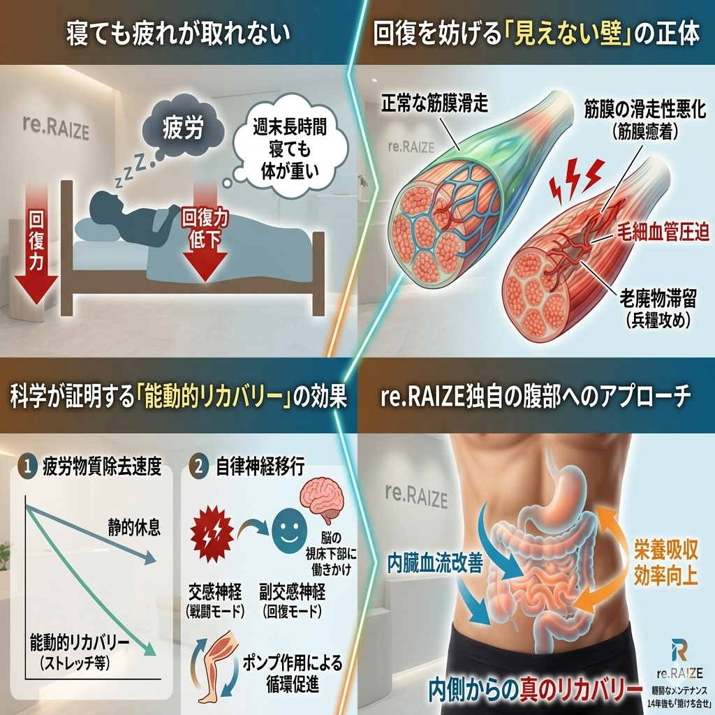「週末に長時間寝たのに体が重い」「マッサージをしても数日後には元通り」。もしあなたがそう感じているなら、それは筋肉の疲れではなく、あなた本来の「回復力(リカバリー能力)」が低下しているのかもしれません。最新の研究データは、回復とは単に「休む」ことではなく、適切な刺激によって「加速させるもの」であると示しています。