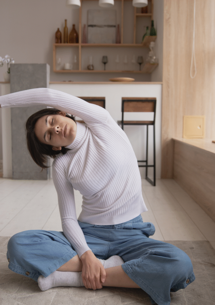 たとえば、両手を胸の横に当てて、ゆっくり深呼吸を繰り返すだけでもOK。息を吸うときに肋骨が広がる感覚を意識し、吐くときは体をリラックスさせることがポイントです。